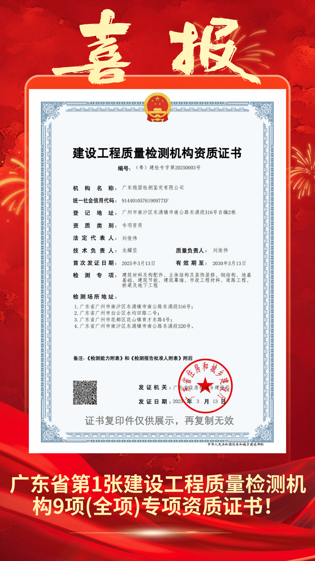 【喜報】全省第1張!廣東穩(wěn)固獲得建設(shè)工程質(zhì)量檢測機構(gòu)9項(全項)專項資質(zhì)證書!